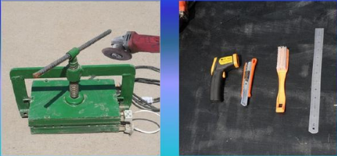 1、先准备工具:热硫化复合式焊接机具一台、打磨机一台、钉枪一个、美工刀一把,刷子一个,铁尺一把。