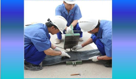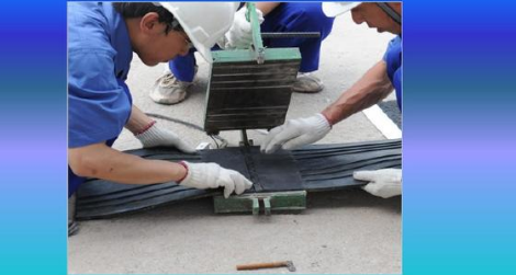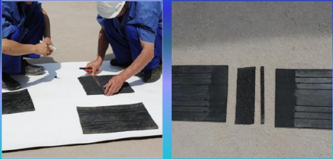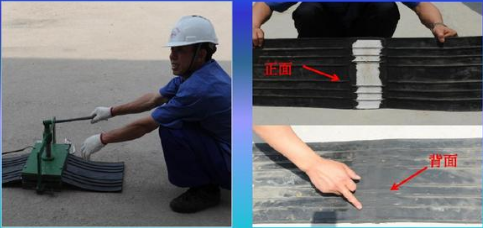 7、把10cm宽生橡胶帮接条平铺在止水带的打磨面上,保证接缝两侧宽度均等。